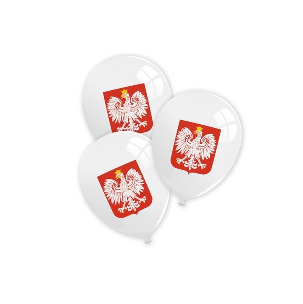 Balony pastelowe białe z nadrukiem Godła Polski. Bardzo wytrzymałe, łatwe w nadmuchaniu.