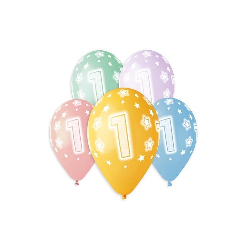 W opakowaniu znajduje się 5 pastelowych różnokolorowych balonów z daną cyfrą.