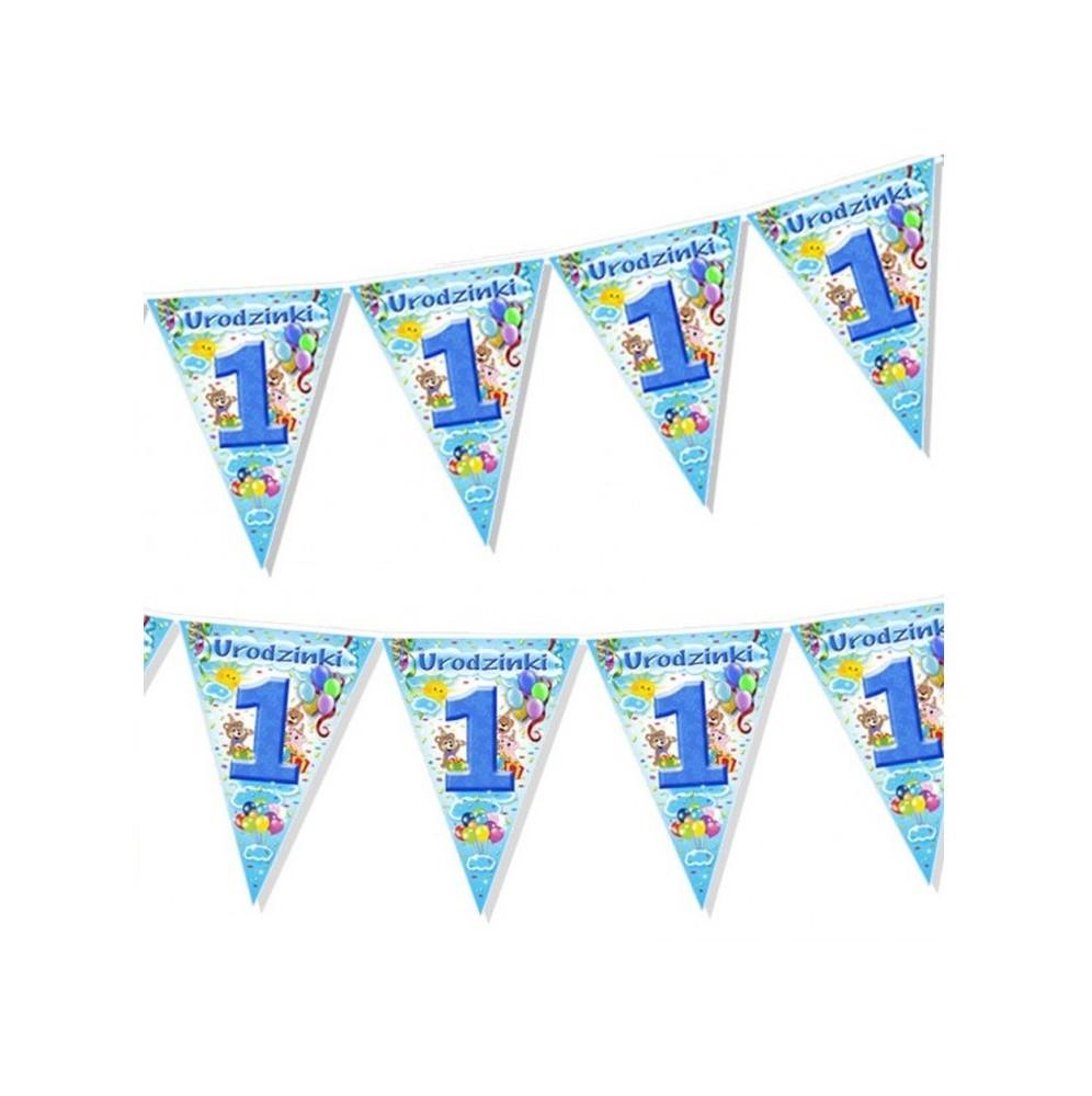 Na chorągiewkach, nadrukowane (z dwóch stron) niebieskie jedynki z za których wyglądają wesołe zwierzaczki. Kolorystyczny, niebieski dodatek na pierwsze urodziny chłopca.