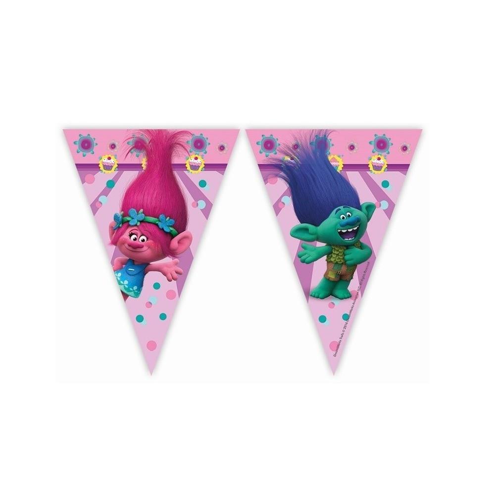 Foliowy banner z postaciami z bajki Trolls. Banner składa się z 9 flag umieszczonych na tasiemce.