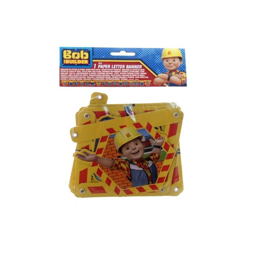 Fantastyczny tekturowy banner z literami tworzącymi napis „Happy Birthday” oraz postacią Boba Budowniczego.