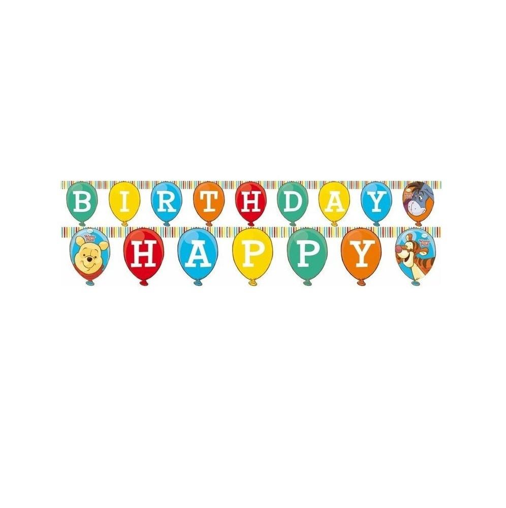 Kolorowy, tekturowy baner z literami tworzącymi napis „Happy Birthday” i flagami z bohaterami Kubusia Puchatka.