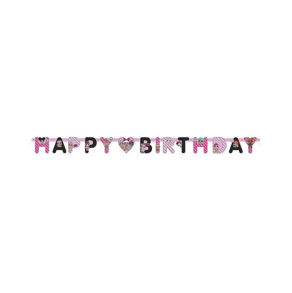 Banner urodzinowy w kształcie liter HAPPY BIRTHDAY z postaciami z Lol Surprise.