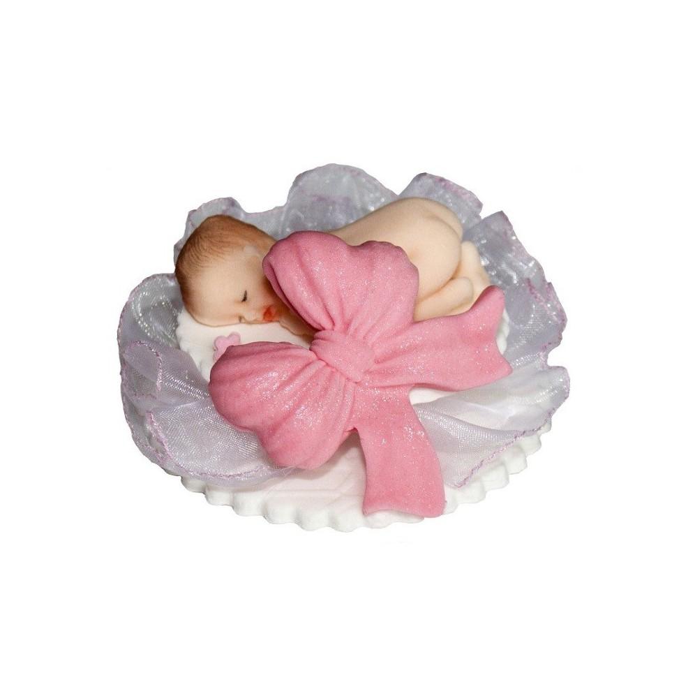 Bobas na tiulu z kokardą jest dekoracją która w wyjątkowy sposób udekoruje Państwa tort z okazji tak ważnego święta naszego dziecka jakim jest chrzest. Dekoracja zawiera elementy z cukru jak również elementy nie do spożycia. Dekoracja przeznaczona na tort dla dziewczynki. Rozmiary figurki: długość ozdoby 8cm, wysokość 5cm.