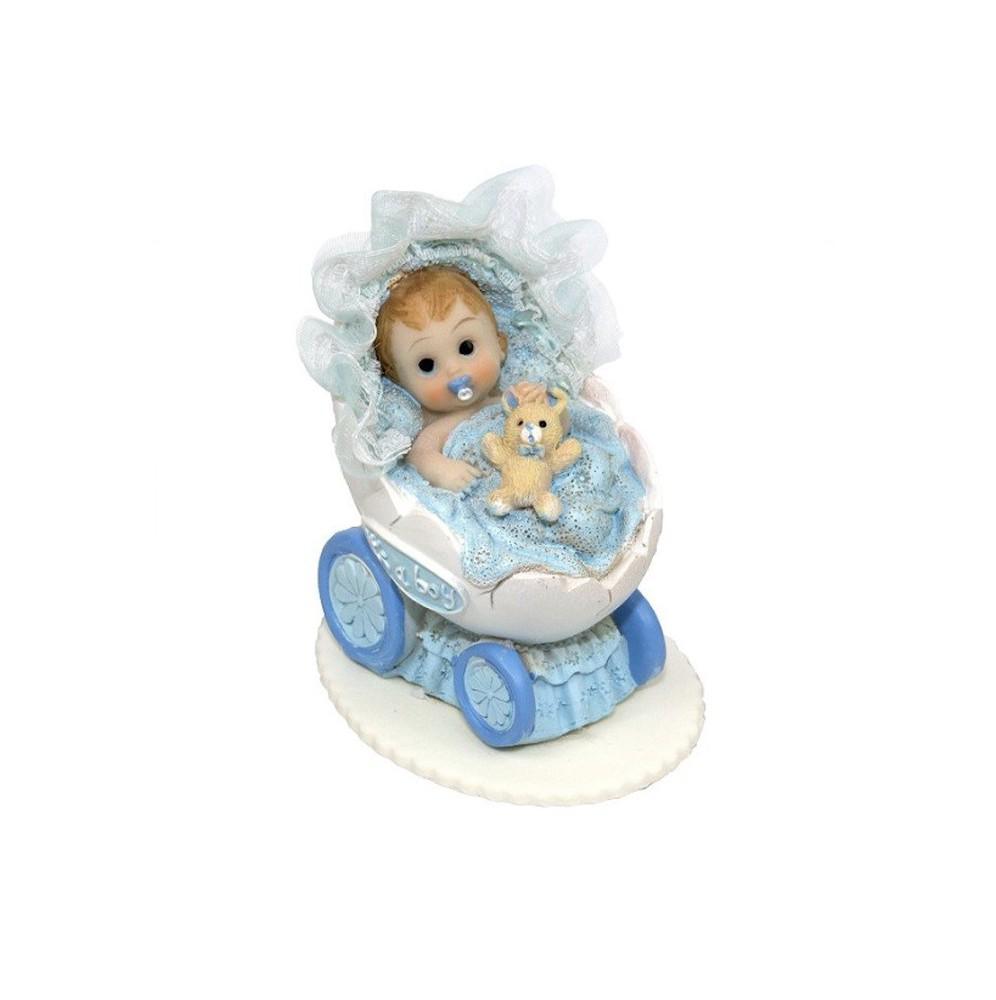 Bobas w wózeczku to dekoracja na chrzciny który służy jako figurka na tort z okazji tego bardzo ważnego wydarzenia. Podstawa tej ozdoby jest wykonana z cukru natomiast cała figurka jest wykonana z wysokogatunkowego materiału sztucznego który nie nadaję się do spożycia. Figurka na tej aukcji przeznaczona jest do dekoracji tortu dla chłopca. Rozmiary: średnica podstawy:6,5cm, wysokość figurki około 9cm.