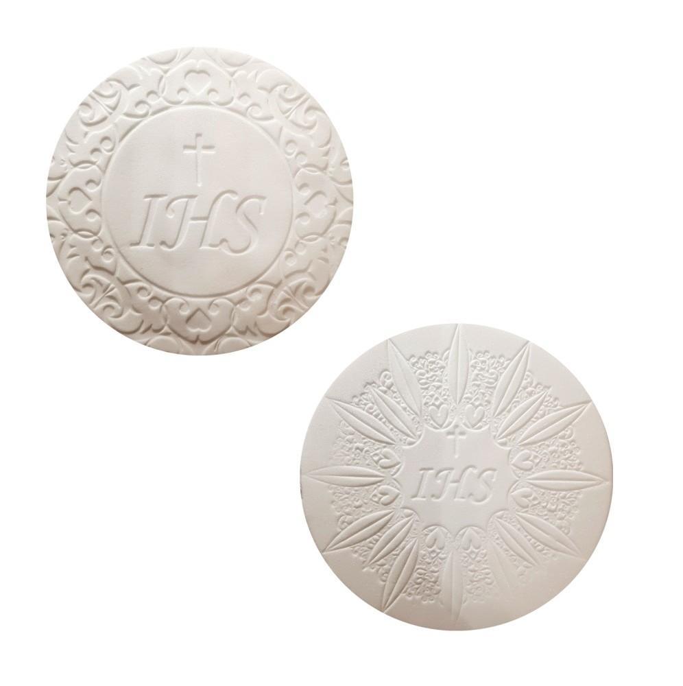 Efektowne dekoracje leżące w postaci hostii białych w 2 wzorach na komunię idealnie przyozdobi Państwa tort z okazji tego ważnego święta.