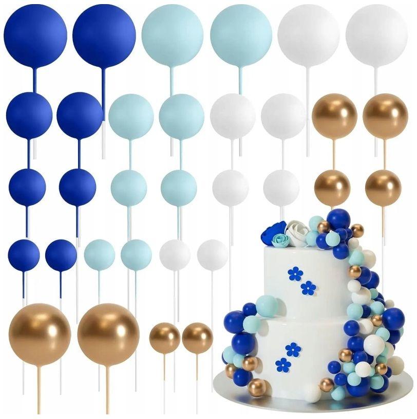 Zestaw dekoracyjnych kul w kolorach niebieskim, złotym i białym to propozycja, która nada wypiekom wyjątkowego charakteru. Idealny do eleganckich dekoracji tortów, ciast i innych słodkości.