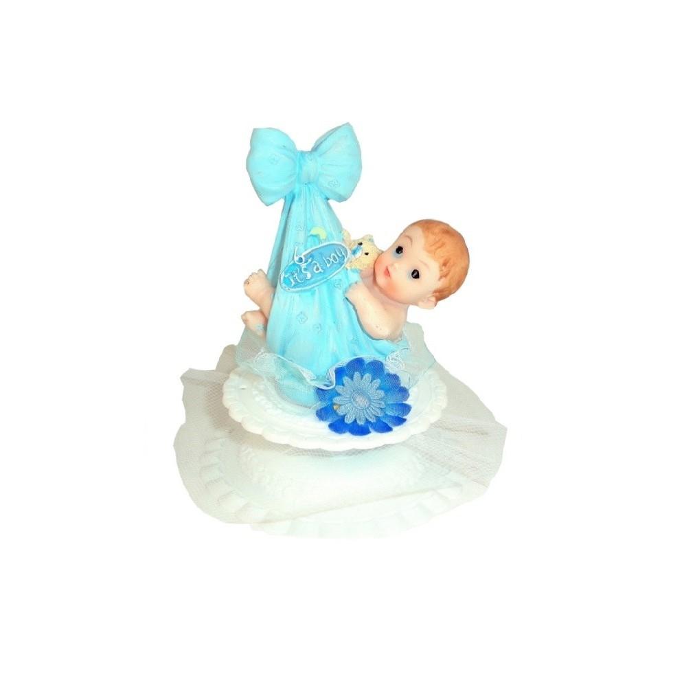 Dzidziuś w kokardzie to figurka której przeznaczeniem jest udekorowanie tortu na chrzciny. Dekoracja jest w całości  wykonana z materiałów sztucznych i nie nadaje się do spożycia. Ozdoba jest dedykowana dla chłopca. Rozmiar dekoracji: średnica podstawy:10cm, wysokość figurki około 12,5cm.