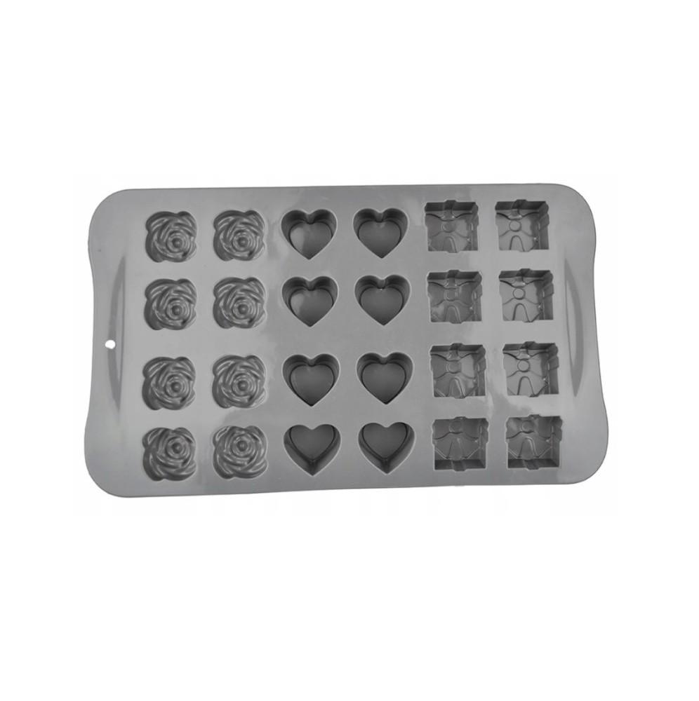 Forma silikonowa do wyrobu domowych czekoladek i pralinek z wgłębieniami w kształcie serduszek, różyczek i prezentów.