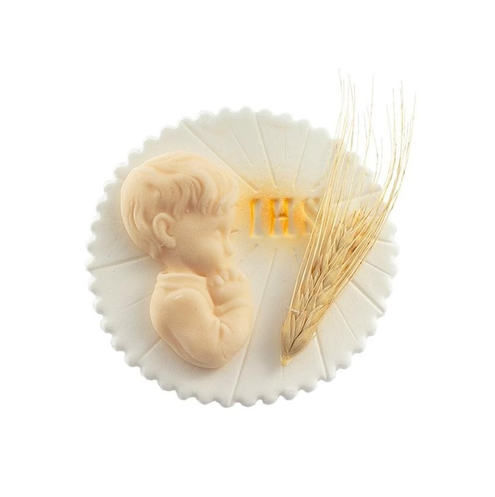 Efektowna dekoracja leżąca w postaci hostii chłopczyka z kłosem na komunię idealnie przyozdobi Państwa tort z okazji tego ważnego święta.