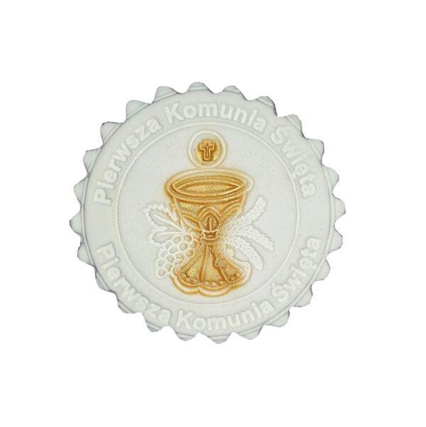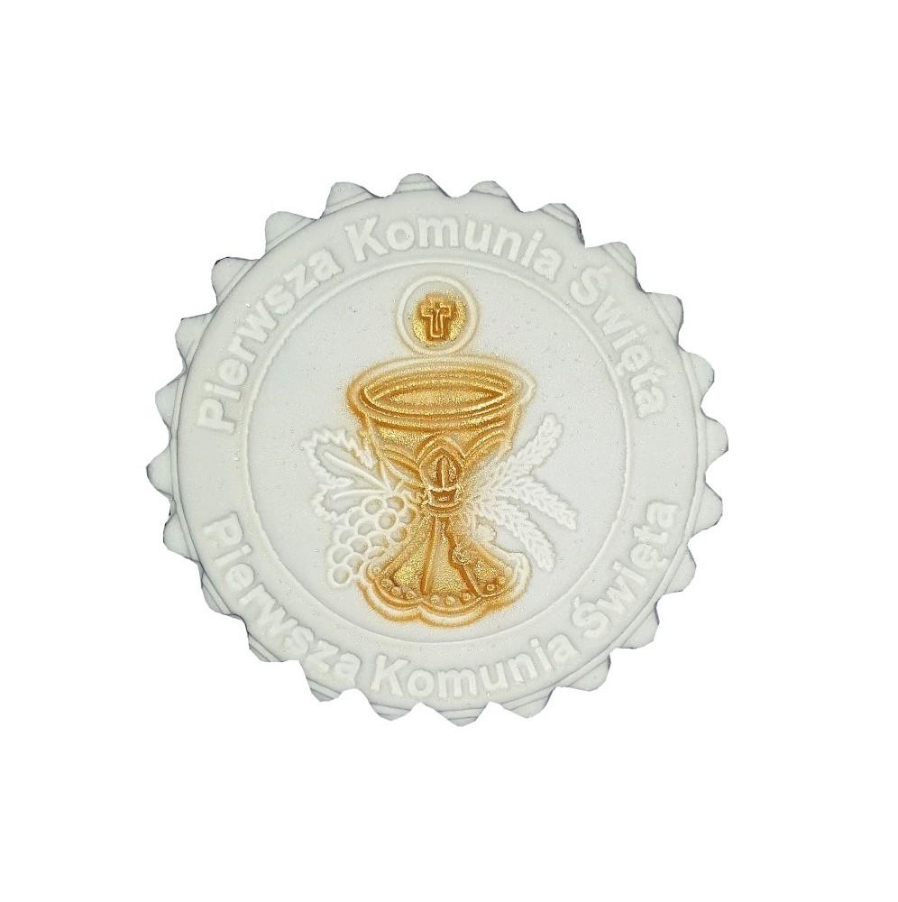 Efektowna dekoracja leżąca w postaci hostii z kielichem koloru złotego na komunię idealnie przyozdobi Państwa tort z okazji tego ważnego święta.