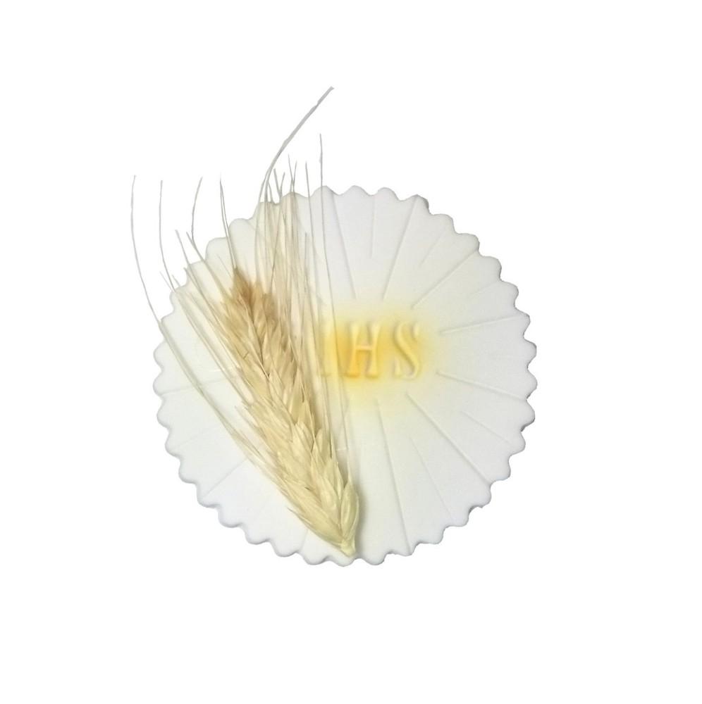 Efektowna dekoracja leżąca w postaci hostii z kłosem na komunię idealnie przyozdobi Państwa tort z okazji tego ważnego święta.