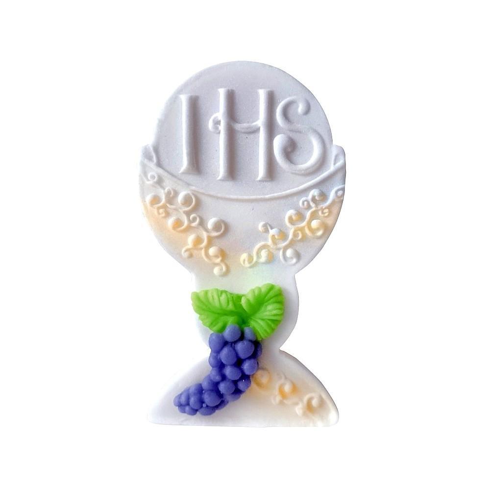 Efektowna dekoracja leżąca w postaci leżącego płaskiego kielicha z winogronem na komunię idealnie przyozdobi Państwa tort z okazji tego ważnego święta.