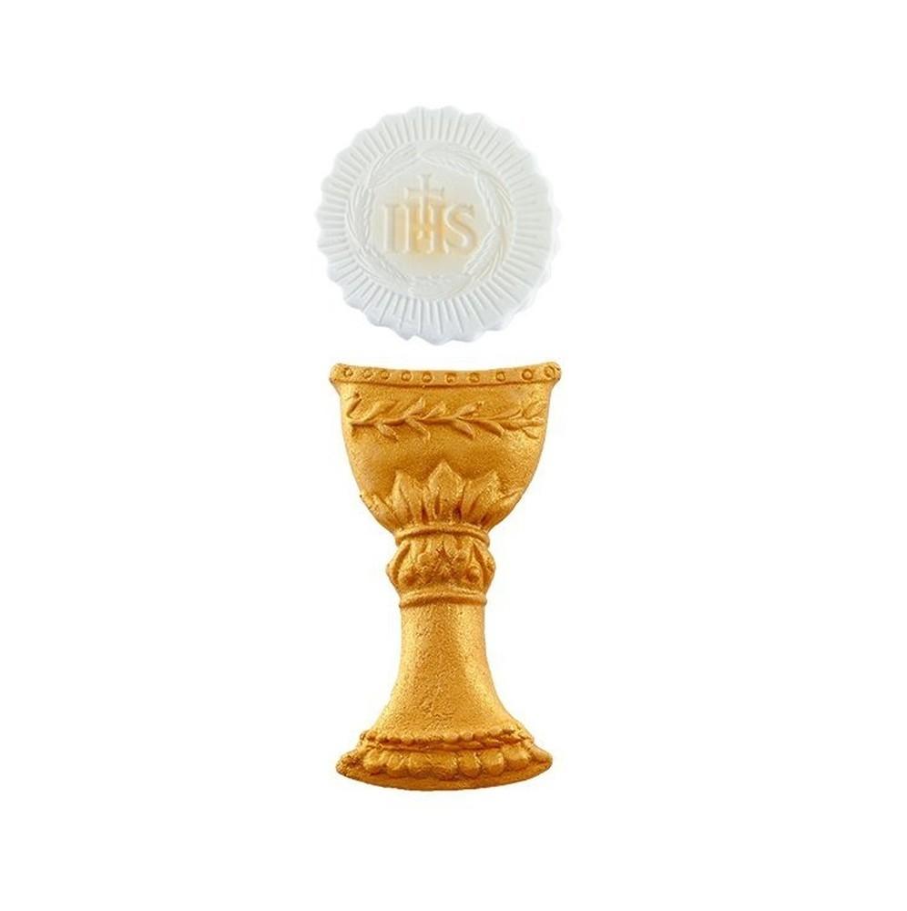 Wyjątkowy kielich komunijny leżący koloru złotego razem z hostią to idealny komplet do udekorowania tortu komunijnego.