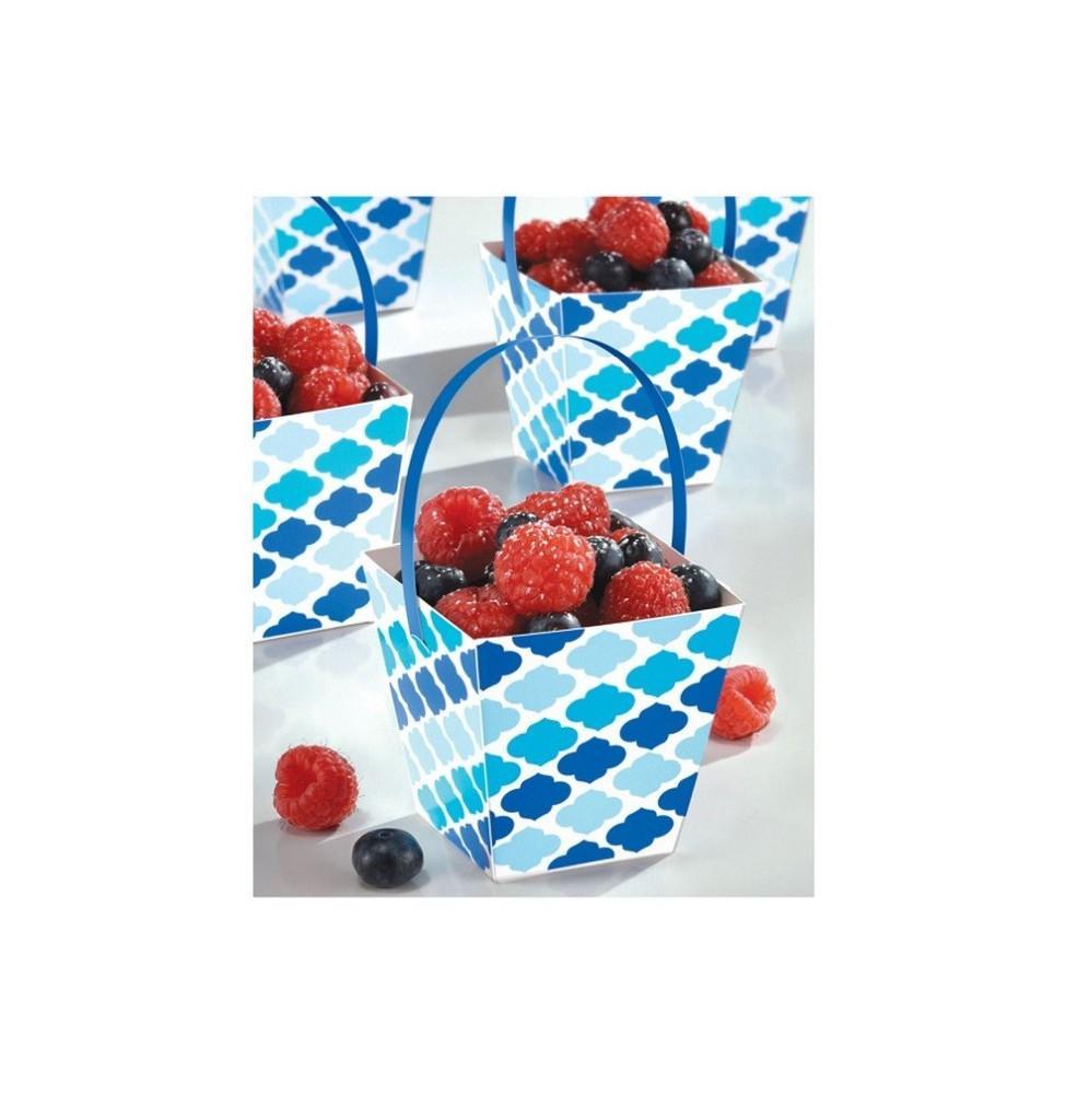 Fantastyczny dekoracyjny koszyczek koloru niebieskiego idealny na przyjęcie urodzinowe.