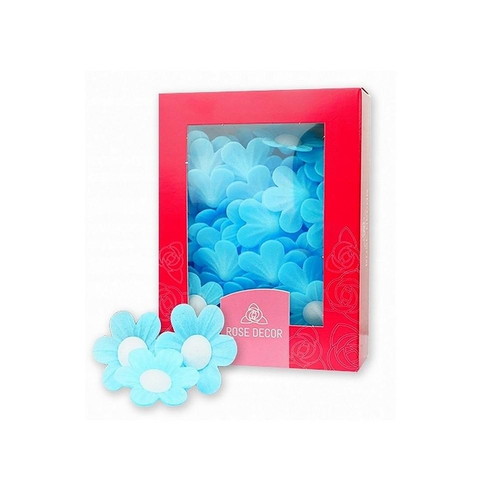 Efektowna dekoracja w kształcie delikatnych kwiatów – Niezapominajek – wykonanych z opłatka dla ozdoby i podkreślenia wyjątkowego charakteru okazjonalnych ciast i deserów.