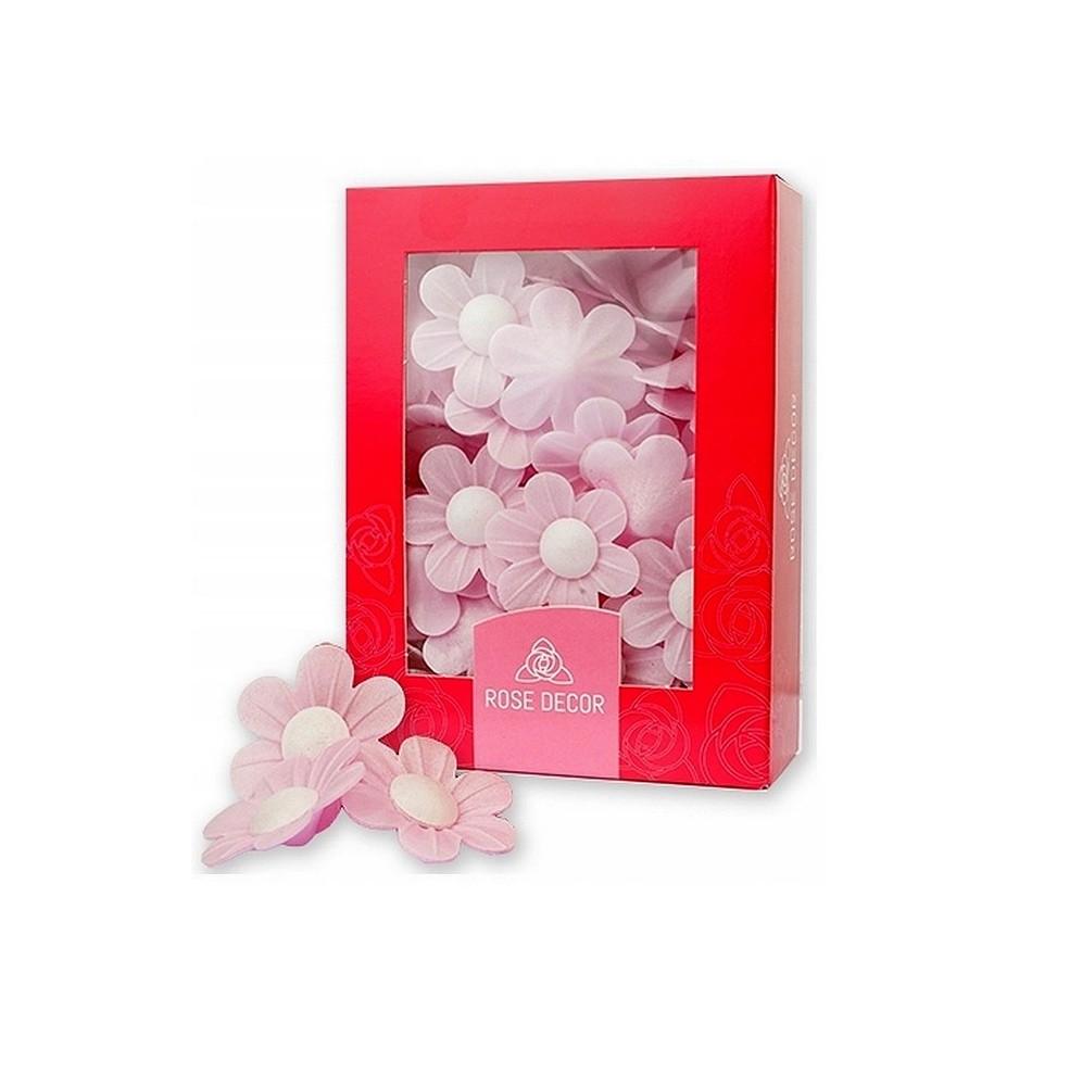 Efektowna dekoracja w kształcie delikatnych kwiatów – Niezapominajek – wykonanych z opłatka dla ozdoby i podkreślenia wyjątkowego charakteru okazjonalnych ciast i deserów.