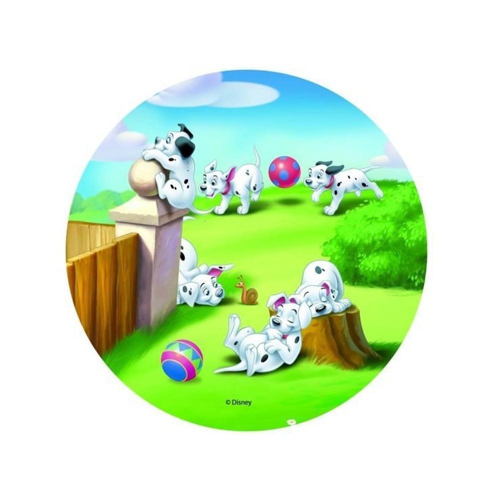Jadalny okrągły opłatek na tort z wafla z motywem bajki 101 Dalmatyńczyków. Nadruk na opłatku został wykonany za pomocą jadalnych atestowanych tuszy spożywczych. Wydruk został wykonany specjalistyczną drukarką. Kolorystyka opłatka może nieznacznie się różnić od projektu graficznego (kolor opłatka jest intensywniejszy po nałożeniu na masę).