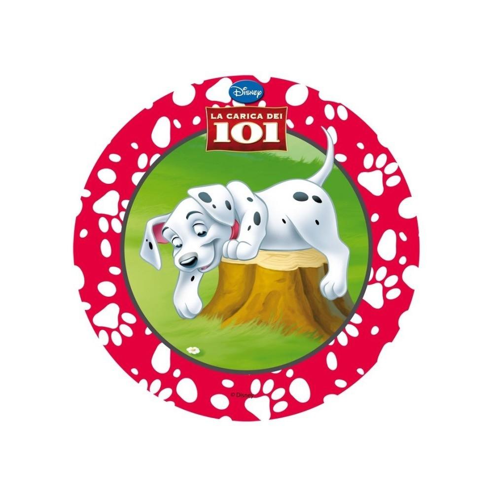 Jadalny okrągły opłatek na tort z wafla z motywem bajki 101 Dalmatyńczyków. Nadruk na opłatku został wykonany za pomocą jadalnych atestowanych tuszy spożywczych. Wydruk został wykonany specjalistyczną drukarką. Kolorystyka opłatka może nieznacznie się różnić od projektu graficznego (kolor opłatka jest intensywniejszy po nałożeniu na masę).