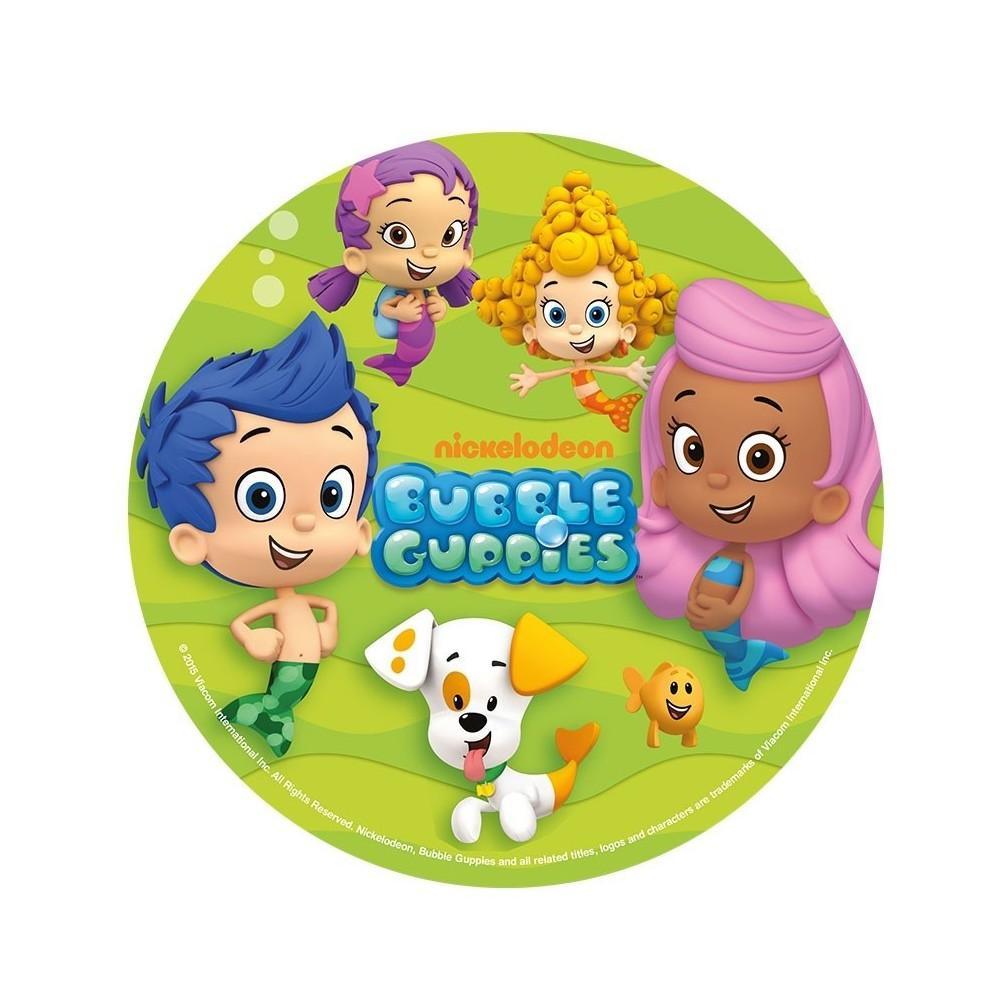 Jadalny okrągły opłatek na tort z wafla z motywem bajki Bąbelkowy świat gupików. Nadruk na opłatku został wykonany za pomocą jadalnych atestowanych tuszy spożywczych. Wydruk został wykonany specjalistyczną drukarką. Kolorystyka opłatka może nieznacznie się różnić od projektu graficznego (kolor opłatka jest intensywniejszy po nałożeniu na masę).