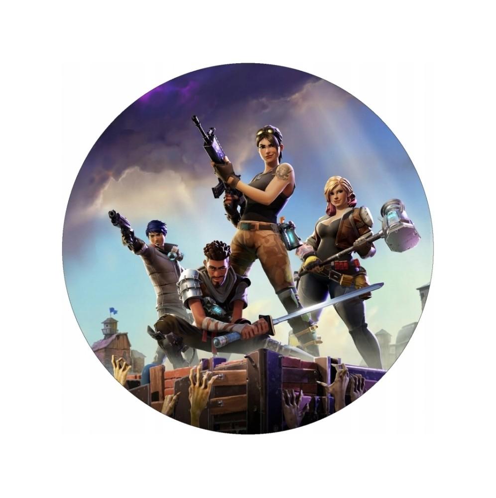Jadalny okrągły opłatek na tort z wafla z motywem Fortnite.