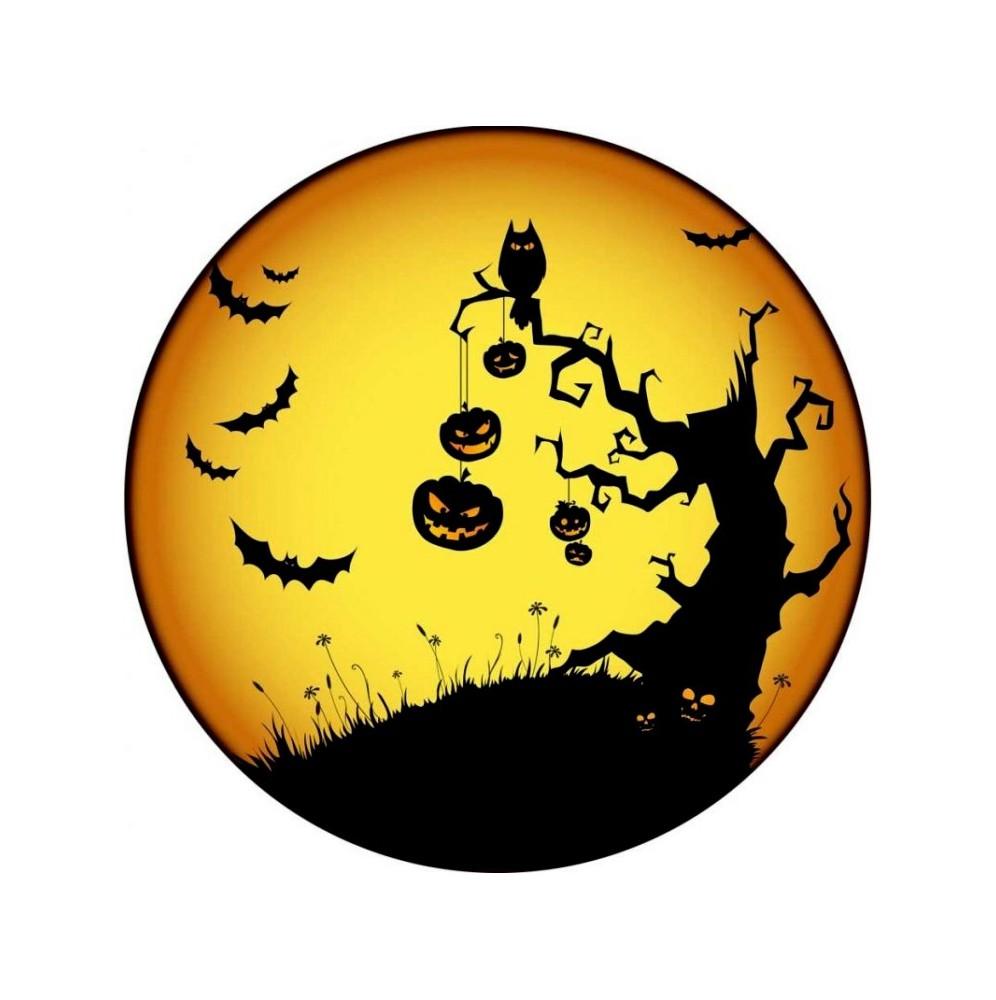 Jadalny okrągły opłatek na tort z wafla z motywem Halloween. Nadruk na opłatku został wykonany za pomocą jadalnych atestowanych tuszy spożywczych. Wydruk został wykonany specjalistyczną drukarką. Kolorystyka opłatka może nieznacznie się różnić od projektu graficznego (kolor opłatka jest intensywniejszy po nałożeniu na masę).