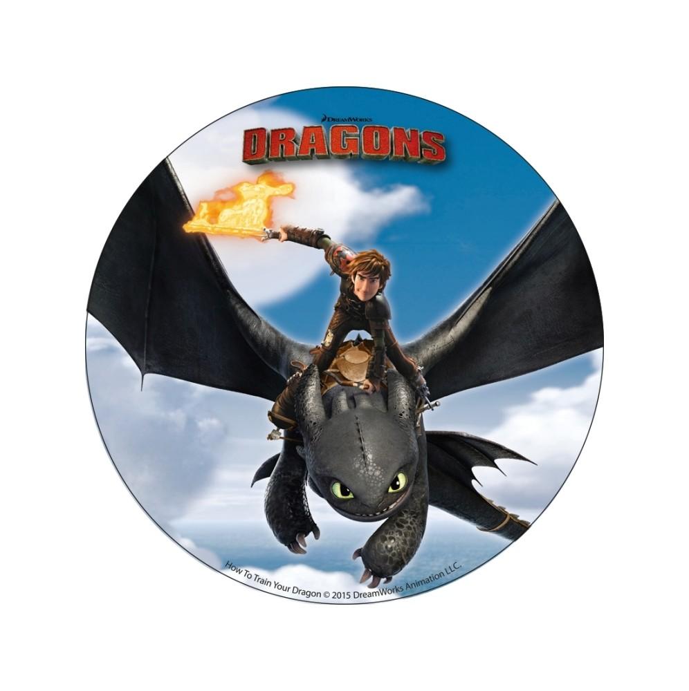 Gruby jadalny okrągły opłatek na tort z wafla z motywem bajki Jak Wytresować Smoka.