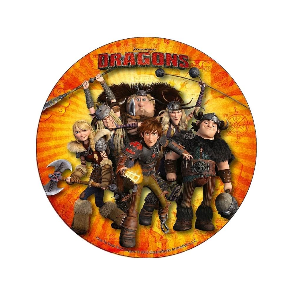 Gruby jadalny okrągły opłatek na tort z wafla z motywem bajki Jak Wytresować Smoka.