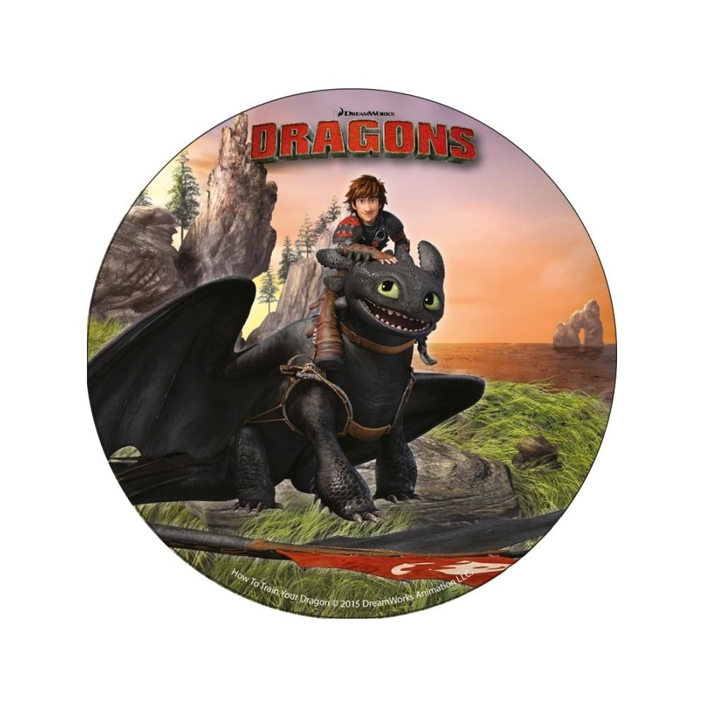 Gruby jadalny okrągły opłatek na tort z wafla z motywem bajki Jak Wytresować Smoka.