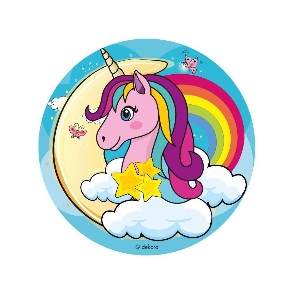 Jadalny okrągły opłatek na tort z wafla z motywem Jednorożca. Nadruk na opłatku został wykonany za pomocą jadalnych atestowanych tuszy spożywczych. Wydruk został wykonany specjalistyczną drukarką. Kolorystyka opłatka może nieznacznie się różnić od projektu graficznego (kolor opłatka jest intensywniejszy po nałożeniu na masę).