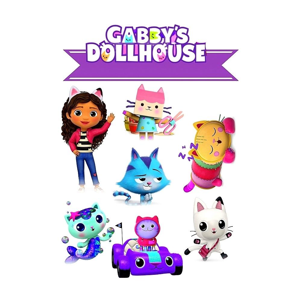 Gruby jadalny prostokątny opłatek na tort z wafla z motywem bohaterów z bajki Koci Domek Gabi.