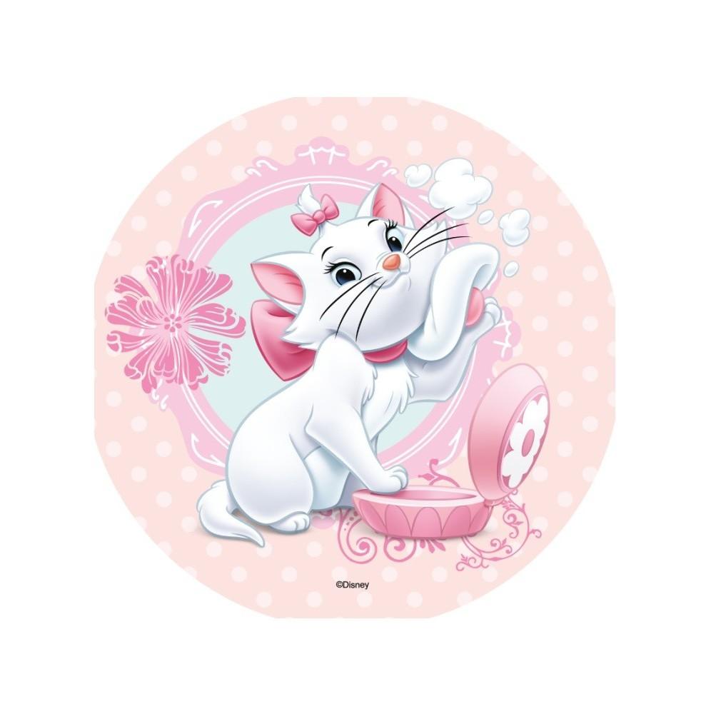 Jadalny okrągły opłatek na tort z wafla z motywem Kotki Marie. Nadruk na opłatku został wykonany za pomocą jadalnych atestowanych tuszy spożywczych. Wydruk został wykonany specjalistyczną drukarką. Kolorystyka opłatka może nieznacznie się różnić od projektu graficznego (kolor opłatka jest intensywniejszy po nałożeniu na masę).