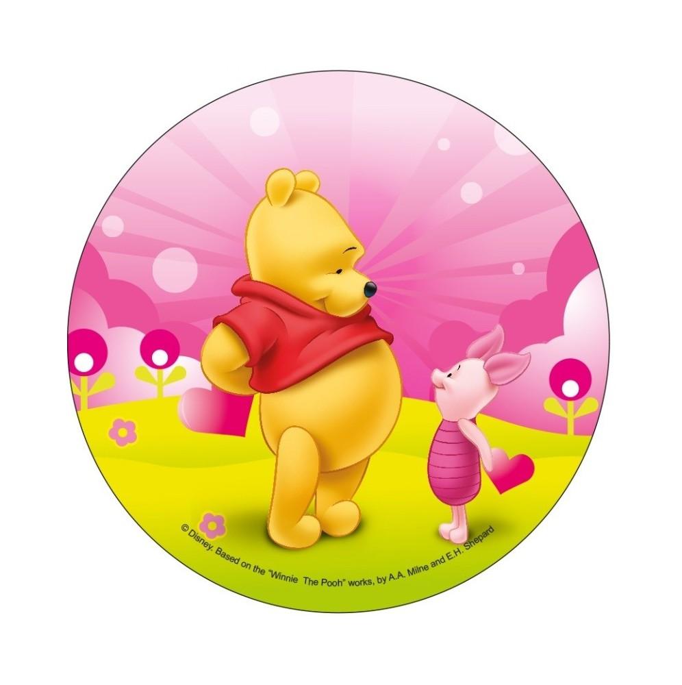 Jadalny okrągły opłatek na tort z wafla z motywem Kubusia Puchatka. Nadruk na opłatku został wykonany za pomocą jadalnych atestowanych tuszy spożywczych. Wydruk został wykonany specjalistyczną drukarką. Kolorystyka opłatka może nieznacznie się różnić od projektu graficznego (kolor opłatka jest intensywniejszy po nałożeniu na masę).