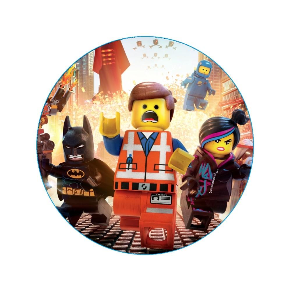 Gruby jadalny okrągły opłatek na tort z wafla z motywem Lego Movie.