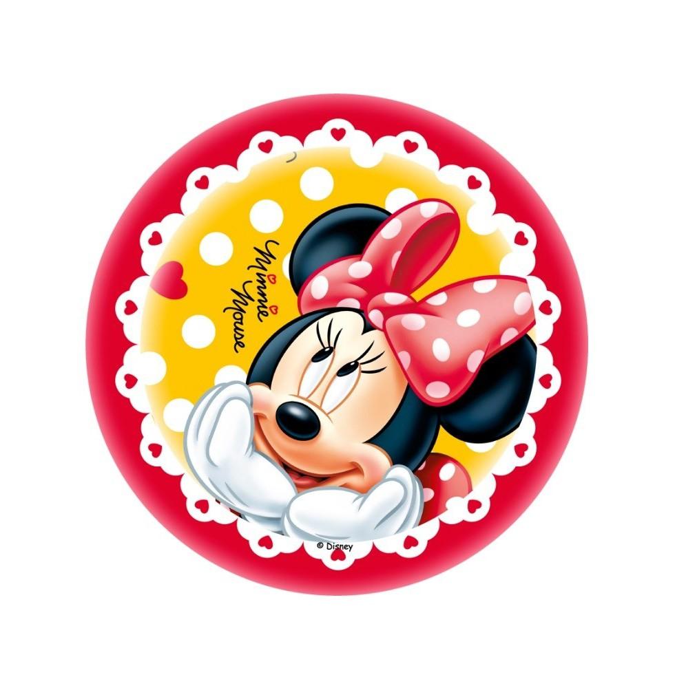 Jadalny okrągły opłatek na tort z wafla z motywem Myszki Minnie. Nadruk na opłatku został wykonany za pomocą jadalnych atestowanych tuszy spożywczych. Wydruk został wykonany specjalistyczną drukarką. Kolorystyka opłatka może nieznacznie się różnić od projektu graficznego (kolor opłatka jest intensywniejszy po nałożeniu na masę).