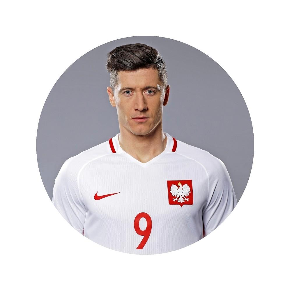 Gruby jadalny okrągły opłatek na tort z wafla z motywem Roberta Lewandowskiego.