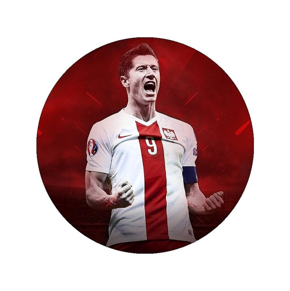 Gruby jadalny okrągły opłatek na tort z wafla z motywem Roberta Lewandowskiego.