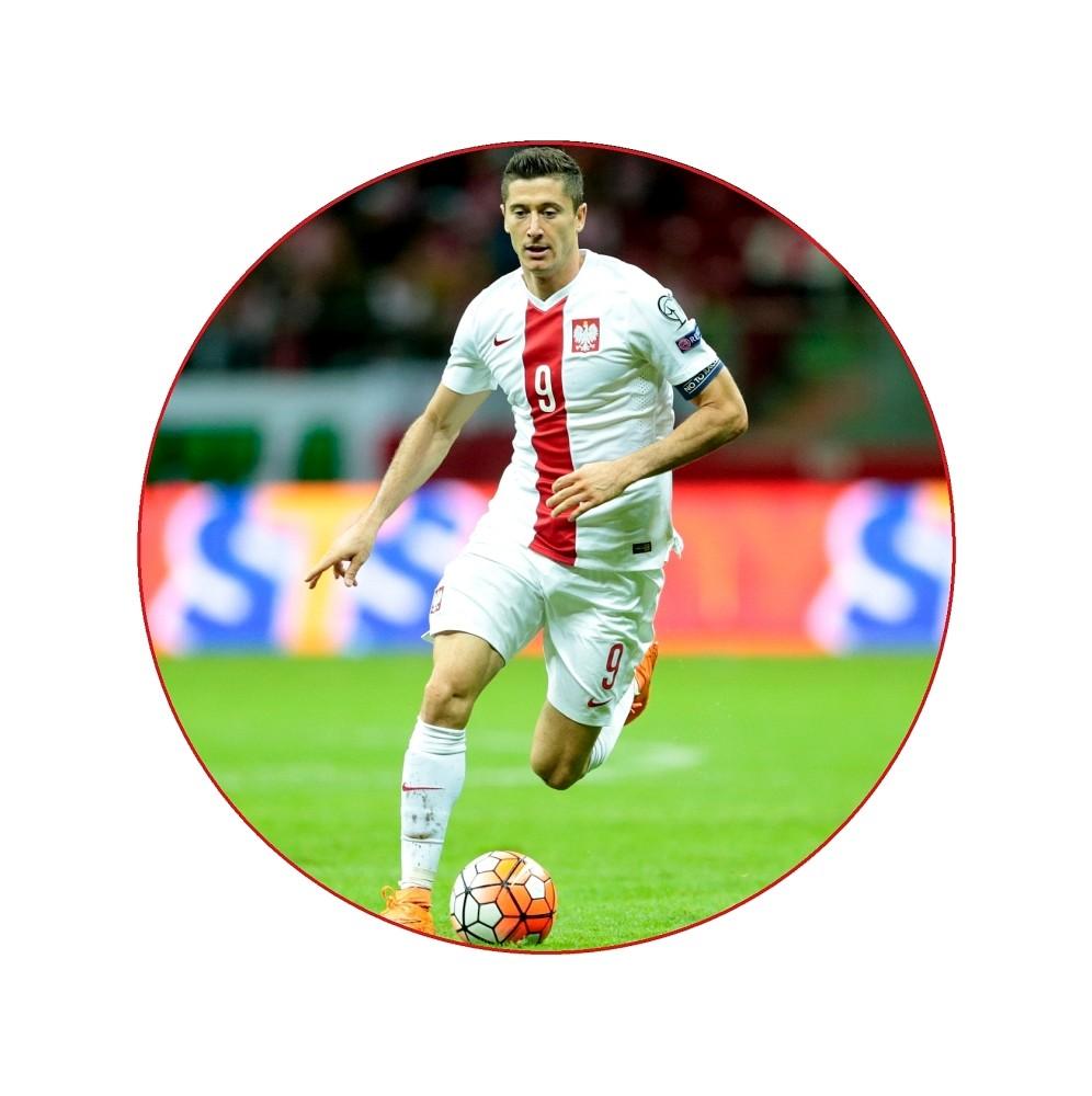 Gruby jadalny okrągły opłatek na tort z wafla z motywem Roberta Lewandowskiego.