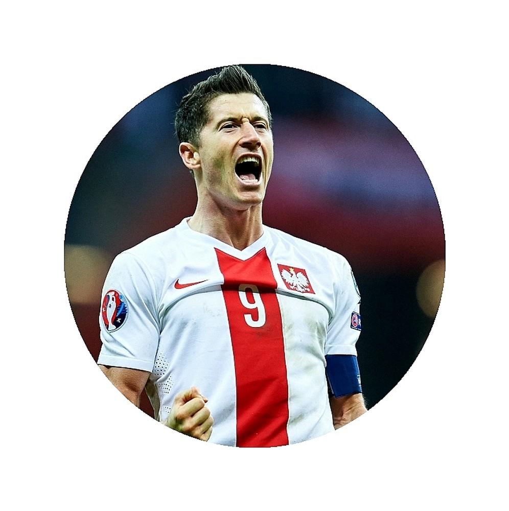 Gruby jadalny okrągły opłatek na tort z wafla z motywem Roberta Lewandowskiego.