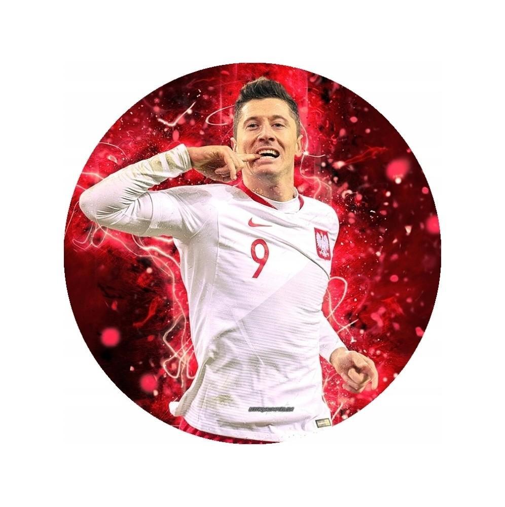 Gruby jadalny okrągły opłatek na tort z wafla z motywem Roberta Lewandowskiego.