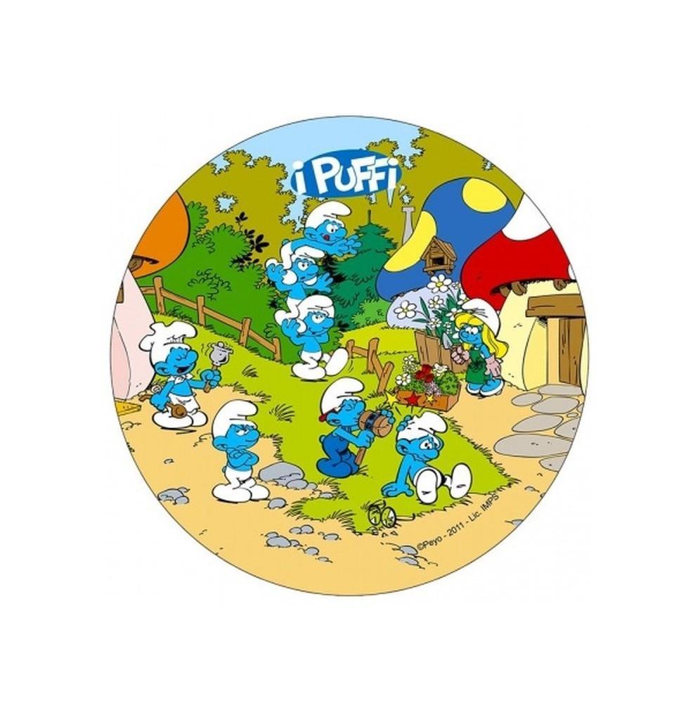 Jadalny okrągły opłatek na tort z wafla z motywem Smerfów. Nadruk na opłatku został wykonany za pomocą jadalnych atestowanych tuszy spożywczych. Wydruk został wykonany specjalistyczną drukarką. Kolorystyka opłatka może nieznacznie się różnić od projektu graficznego (kolor opłatka jest intensywniejszy po nałożeniu na masę).