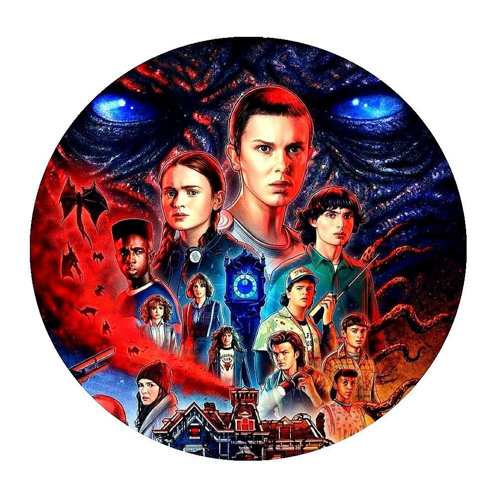 Gruby jadalny okrągły opłatek na tort z wafla z motywem Stranger Things.