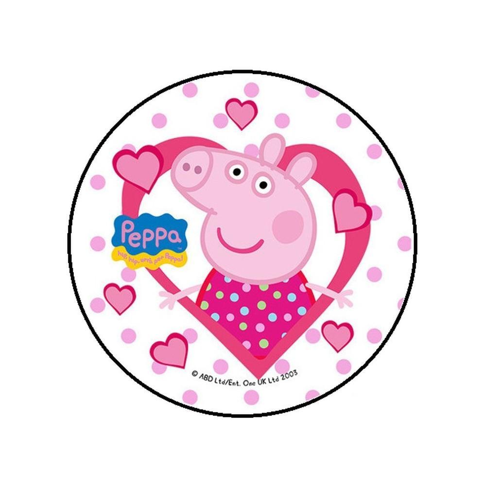 Jadalny okrągły opłatek na tort z wafla z motywem Świnki Peppy. Nadruk na opłatku został wykonany za pomocą jadalnych atestowanych tuszy spożywczych. Wydruk został wykonany specjalistyczną drukarką. Kolorystyka opłatka może nieznacznie się różnić od projektu graficznego (kolor opłatka jest intensywniejszy po nałożeniu na masę).