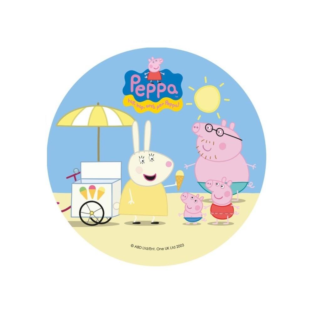 Jadalny okrągły opłatek na tort z wafla z motywem Świnki Peppy. Nadruk na opłatku został wykonany za pomocą jadalnych atestowanych tuszy spożywczych. Wydruk został wykonany specjalistyczną drukarką. Kolorystyka opłatka może nieznacznie się różnić od projektu graficznego (kolor opłatka jest intensywniejszy po nałożeniu na masę).