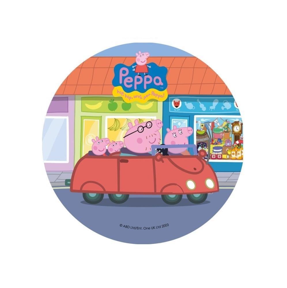 Jadalny okrągły opłatek na tort z wafla z motywem Świnki Peppy. Nadruk na opłatku został wykonany za pomocą jadalnych atestowanych tuszy spożywczych. Wydruk został wykonany specjalistyczną drukarką. Kolorystyka opłatka może nieznacznie się różnić od projektu graficznego (kolor opłatka jest intensywniejszy po nałożeniu na masę).