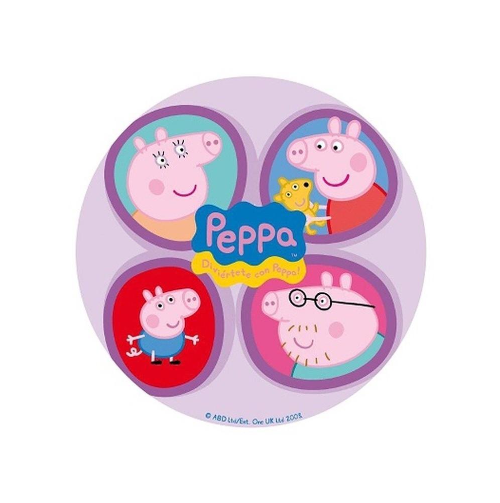 Jadalny okrągły opłatek na tort z wafla z motywem Świnki Peppy. Nadruk na opłatku został wykonany za pomocą jadalnych atestowanych tuszy spożywczych. Wydruk został wykonany specjalistyczną drukarką. Kolorystyka opłatka może nieznacznie się różnić od projektu graficznego (kolor opłatka jest intensywniejszy po nałożeniu na masę).
