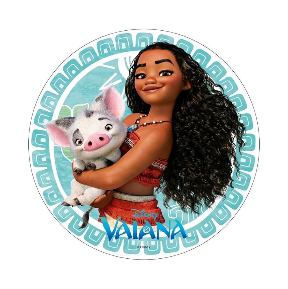 Jadalny okrągły opłatek na tort z wafla z motywem Vaiany:Skarb Oceanu. Nadruk na opłatku został wykonany za pomocą jadalnych atestowanych tuszy spożywczych. Wydruk został wykonany specjalistyczną drukarką. Kolorystyka opłatka może nieznacznie się różnić od projektu graficznego (kolor opłatka jest intensywniejszy po nałożeniu na masę).