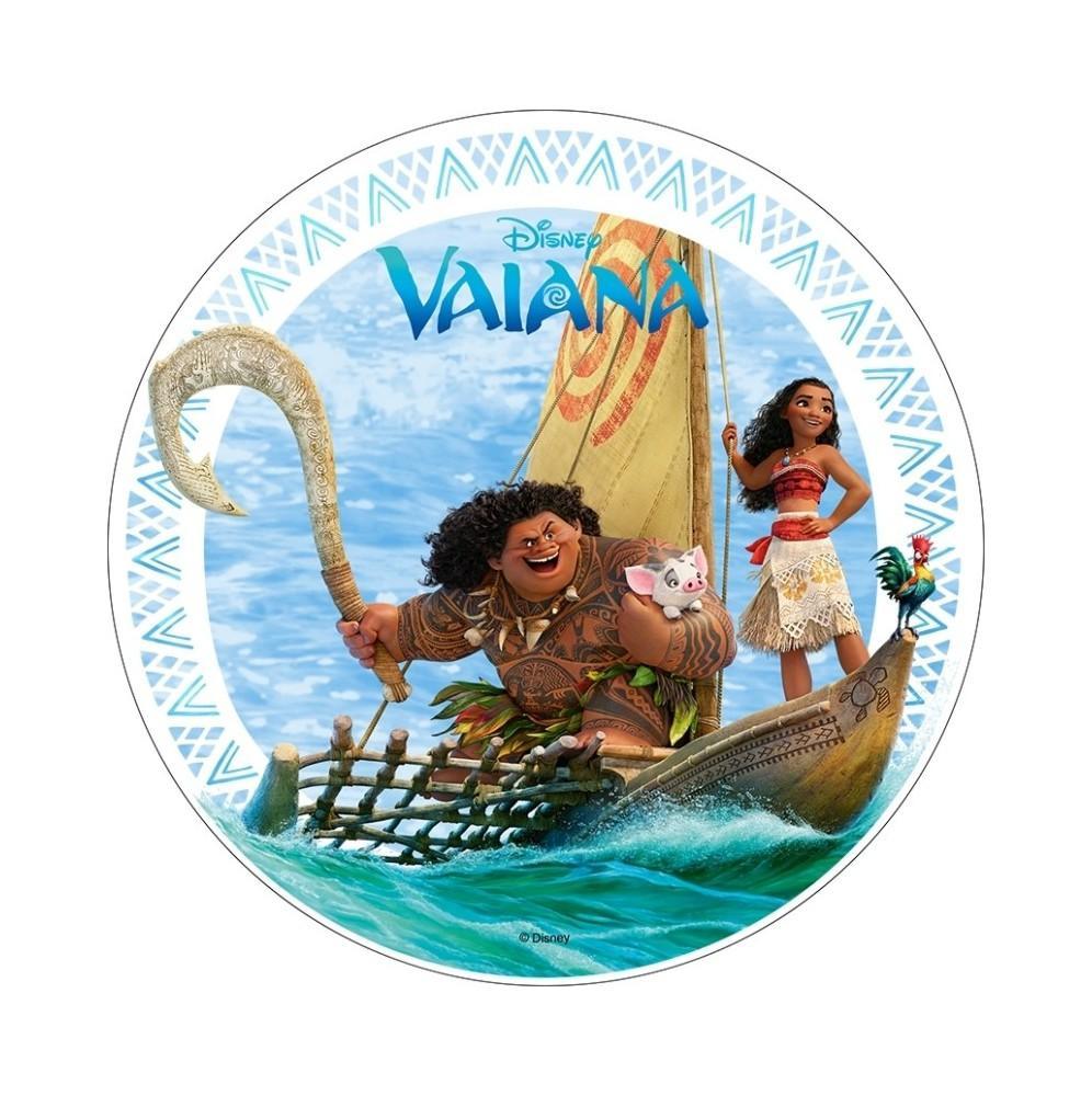 Jadalny okrągły opłatek na tort z wafla z motywem Vaiany:Skarb Oceanu. Nadruk na opłatku został wykonany za pomocą jadalnych atestowanych tuszy spożywczych. Wydruk został wykonany specjalistyczną drukarką. Kolorystyka opłatka może nieznacznie się różnić od projektu graficznego (kolor opłatka jest intensywniejszy po nałożeniu na masę).