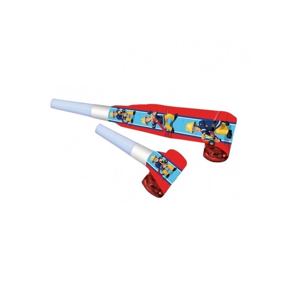 Papierowe trąbki urodzinowe z motywem Strażaka Sama.