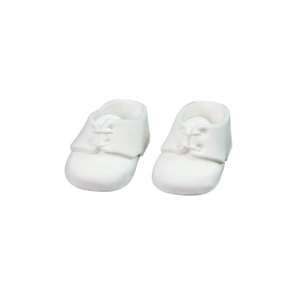 Piękna biała para bucików na chrzest dla chłopca wykonana z masy cukrowej.